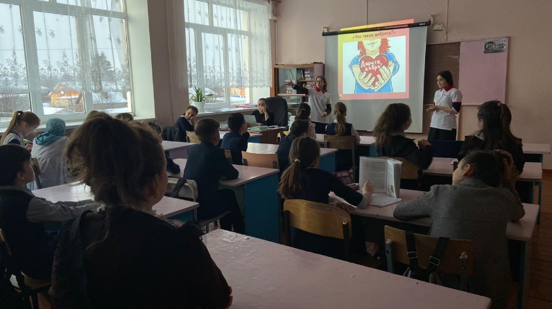Сыйныф сәгатьләрендә укучылар белән әңгәмәләр оештырдылар, кечкенә сыйныф укучыларына дәресләрдә ярдәм иттеләр. Шулай ук "Киләчәк волонтерлары" дигән нәфис фильм карап фикерләр алыштылар