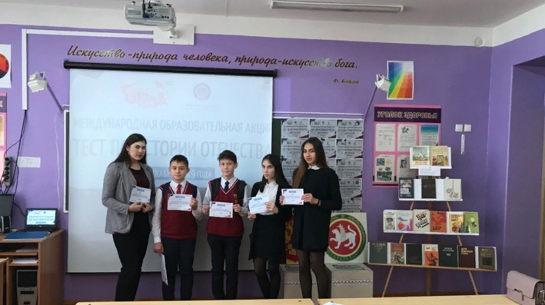 13 декабрь көнне Россия Федерациясенең барлык субъектларында " Ватан тарихы буенча Тест»халыкара акциясе узды. Безнең районда тест үткәрү мәйданчыгы - Җәлил икенче урта мәктәбе булды. Безнең гимназия укучылары да әлеге чарада катнаштылар һәм катнашучы сертификатларын алдылар.