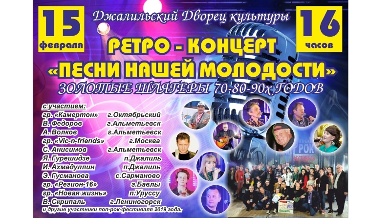 15 февраль көнне Җәлил мәдәният сараенда "Безнең яшьлек җырлары" ретро-концерты узачак, анда төрле шәһәрләрдән килгән артистлар 70-80-90 елларда Алтын шлягерлар башкарачак.