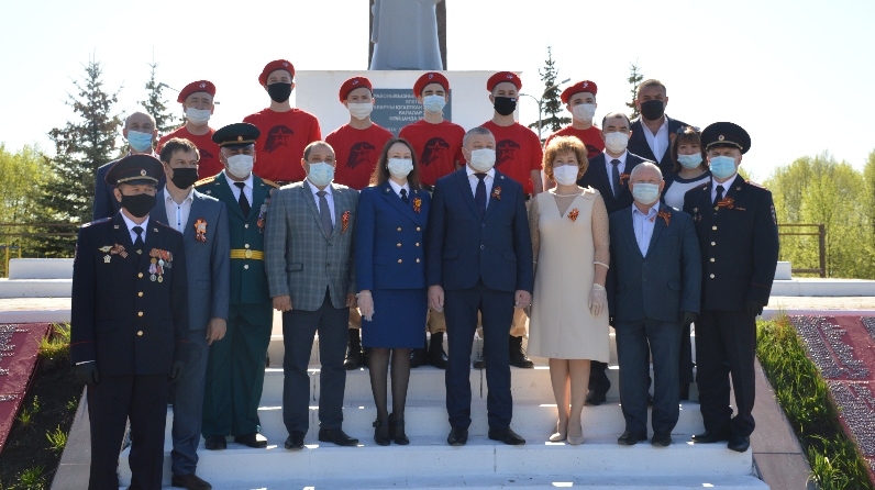 Район башлыгы Фәрит Хөснуллин, хәрби-патриотик тәрбия оешмалары җитәкчеләре, яшь армиячеләр Бөек Ватан сугышында һәлак булганнар истәлегенә тере чәчәкләр, веноклар салдылар.