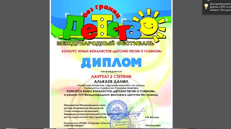 ХХII Халыкара фестиваленең «Балалар өчен җырлар» конкурсында Жәлил гимназиясенең укучысын Алькаев Данилны чираттагы жинуе - IIнче дәрәҗә Лауреат булуы белән котлыйбыз! Житәкчесе Гыйльфанова Р.А. Киләчәк иҗади уңышлар телибез!