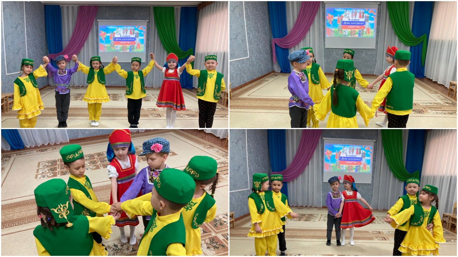 4 ноябрьдә бөтен Россия Халыклар бердәмлеге көнен билгеләп үтә. Бу-патриотизм, үзара ярдәмләшү һәм барлык халыклар бердәмлеге бәйрәме. Дәүләт бәйрәме алдыннан, атна дәвамында, безнең балалар бакчасының зурлар һәм мәктәпкә әзерлек төркемнәрендә "Ватаныбыз киңлекләре буенча" темасына тематик әңгәмәләр, шөгыльләр үткәрелде, "Безнең Россия" дигән темага презентацияләр күрсәтелде. Чараның максаты: һәркемгә аңлаешлы формада илебезнең күпмилләтле булуы белән ныклы булуын, барлык халыкларның да бер-берсенә карата дус һәм бер-берсенә карата хөрмәт белән яшәвен балаларга җиткерү. Атна "Халыклар дуслыгы-илебезнең көче" дигән чара үткәрү белән тәмамланды.