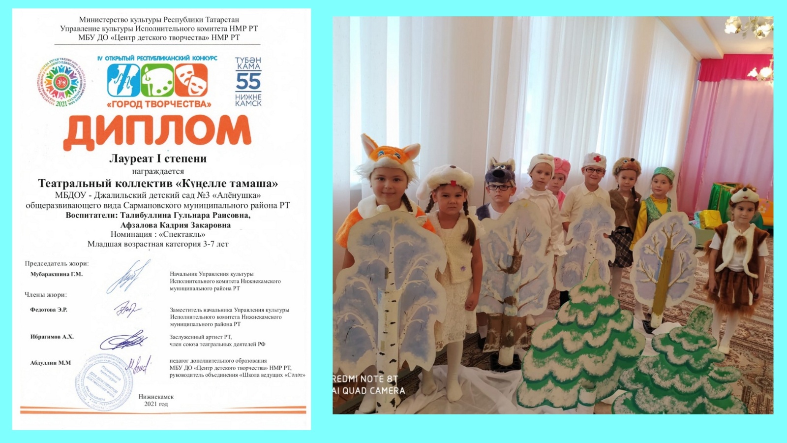 Театр мәктәпкәчә яшьтәге балалар өчен сәнгатьнең иң якты, матур һәм үтемле өлкәләренең берсе булып тора. 3 нче номерлы «Аленушка» балалар бакчасында тәрбияләнүчеләр һәм җитәкчеләр Афзалова К.З., Талибуллина Г.Р. «Иҗат шәһәре» дип аталган IV ачык республика конкурсында Абдулла Алишның «Куян кызы» әкияте буенча куелган спектакль белән катнаштылар. Яшь артистлар үзләренең артистлык сәләтләрен күрсәттеләр һәм I дәрәҗә лауреат булдылар. Балаларны һәм җитәкчеләрне котлыйбыз, киләчәктә дә уңышлар телибез.