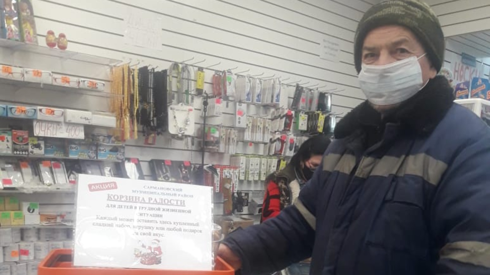 Яңа ел алдыннан Сарман муниципаль районында “Шатлык кәрзине” акциясе уза. Кибеткә килгәч, һәркем баллы тәмлүшкәләр, уенчык яки балалар өчен бүләк ала һәм кәрзингә сала ала.