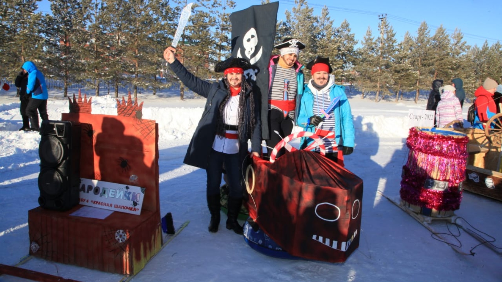 Спорт комплекс кызлары, пират кызлар, “Черная жемчужина” дип аталган, чана- корабларына утырып килгәннәр дә, үзләренең уңышлары белән җырлый-җырлый мактанышып “котны алдылар”. Аларның флагларына төшерелгән адәм башы рәсемнәре генә дә ни тора. Ул чәчләре, ул мыеклары. Район пиратларыннан ким җирләре юк. Каршыңа чыксалар куркырсың! Тик аларның күңелләре шундый изге, яхшы кешеләрне яклап, усалларны гына куркытып йөриләр.