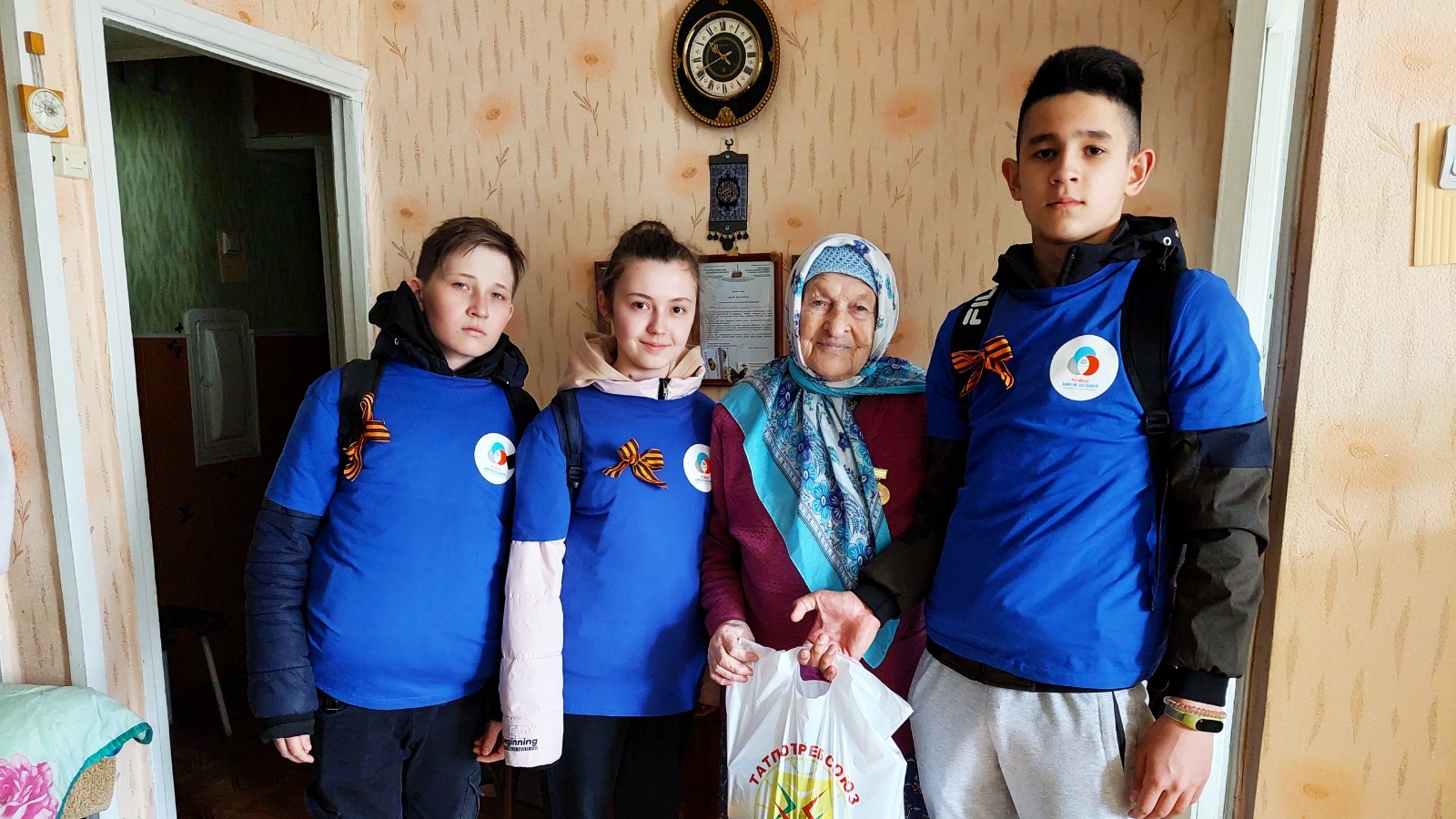 Җиңү көне алдыннан Җиңү волонтерлары бистәдә яшәүче сугыш һәм тыл ветераннарына район Башлыгы бүләкләрен тапшыруда катнаштылар. Укучылар өлкән буын вәкилләренә рәхмәтләрен җиткерделәр, әңгәмә кордылар. Өлкәннәрне тыңлаганда күпләрнең күзләренә яшьләр килде. Никадәр авырлыклар кичергәннәр алар. Шуңа да карамастан, бүген дә алар сафта, киңәшләре, эшләре, яшәү рәвешләре белән үрнәк булып торалар. Сөләйманова Гәүһәр апа белән очрашудан соң сугыш китергән афәтнең ни дәрәҗәдә куркыныч булуын тоемладык. Сугыш кына булмасын, илләр тыныч булсын.