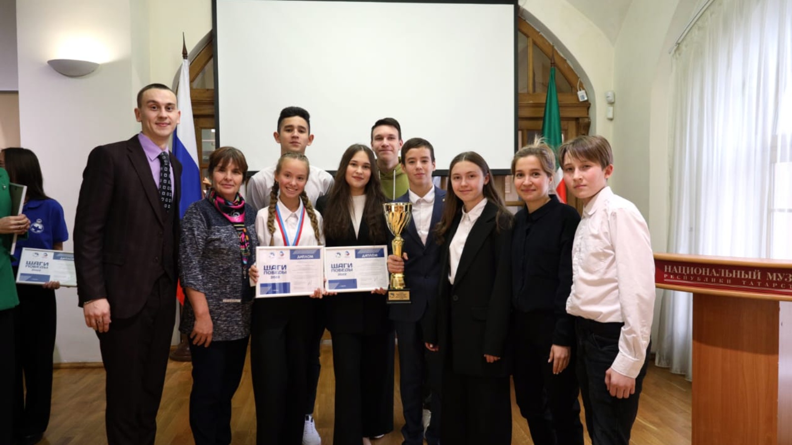 Бүген Татарстан Республикасының Милли музеенда "Җиңү адымнары -2022" республика проектының җиңүчеләрен бүләкләү тантанасы булды. Мәктәп командасы ике номинациядә бүләкләнде. Нигматуллина Наилә - иң яхшы волонтер командасы командиры исеменә лаек булды, ә Миннегалиева Э.Х. җитәкчелегендәге команда "Проектны иң яхшы тормышка ашыручы" номинациясендә җиңүче Дипломына ия булды. Музейдагы экскурсия, команда белән Казанда булу бик матур хатирә булды. Командага уңышлар, яңа үрләр телибез