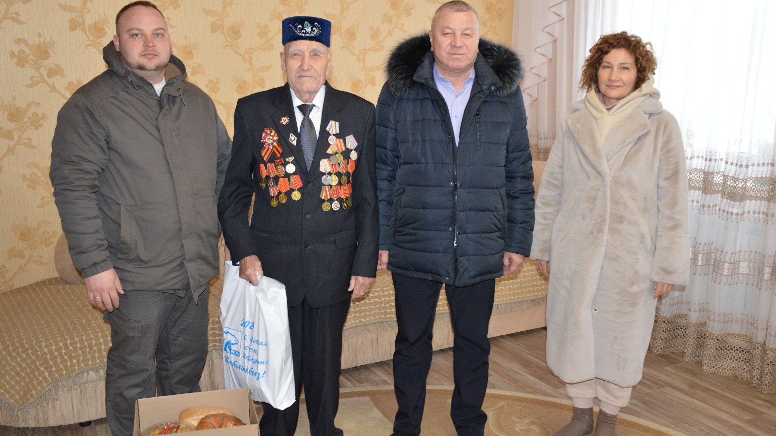 Район территориясендә яшәүче Бөек Ватан сугышы. Аларга сәламәтлек, иминлек теләде, Яңа ел бүләкләре тапшырды.