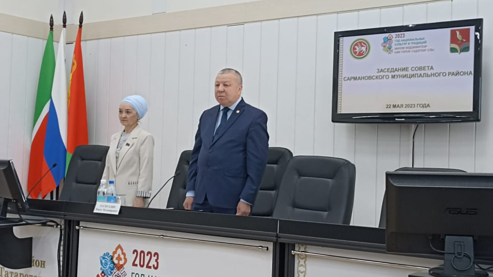 Бүген Ф.М. Хөснуллин рәислегендә дүртенче чакырылыш муниципаль район Советының унҗиденче утырышы узды. Утырышта район прокуроры, район суды рәисе, эчке эшләр бүлеге начальнигы, район учреждениеләре һәм предприятиеләре җитәкчеләре, массакүләм мәгълүмат чаралары вәкилләре катнашты. Сарман муниципаль районында милләтара һәм конфессияара татулыкны тәэмин итүгә юнәлдерелгән дәүләт милли сәясәтен гамәлгә ашыру турындагы доклад белән Башкарма комитет җитәкчесе урынбасары И.Р. Сәхипова чыгыш ясады. Ф.М. Хаҗиева Сарман муниципаль районы Контроль-хисап палатасының 2022 елдагы эшчәнлеге турында хисабы белән чыгыш ясады. Фәрит Мөнәвир улы Хөснуллин Нуртдинов Рәсим Ревовичка район Советы депутаты таныклыгын һәм билгесен тапшырды.