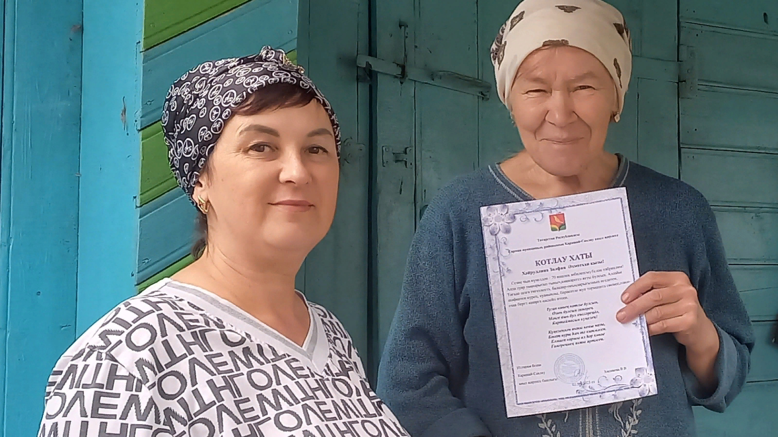 Карашай -Саклау авыл җирлегендә яшәүче Хәйруллина Зөлфия Әхмәтхан кызы үзенең 70 яшьлек юбилеен билгеләп үтә.Аны авыл җирлеге башлыгы Хөсниева В. В. котлады.