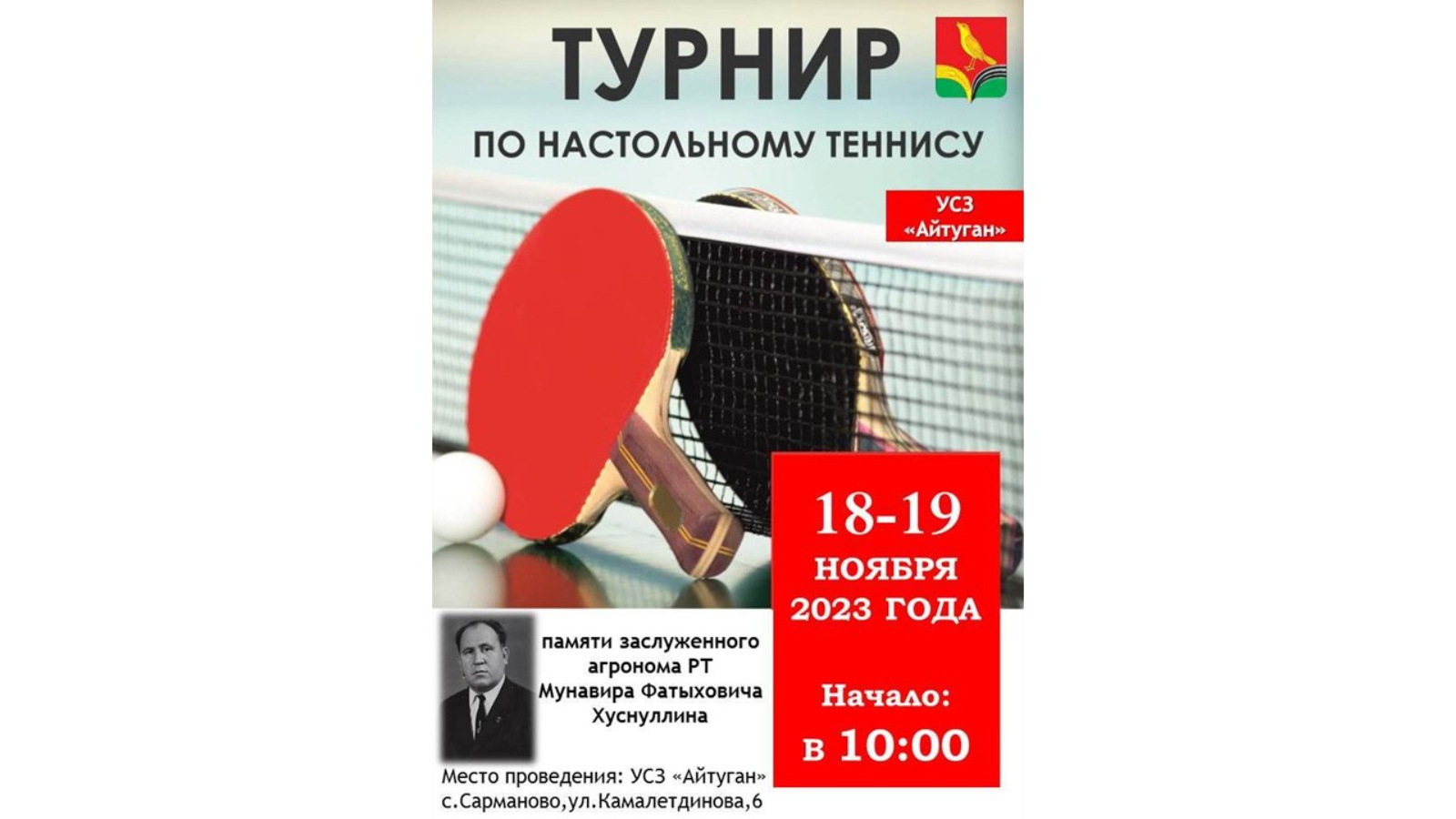 2023 елның 18 һәм 19 ноябрендә Татарстан Республикасының атказанган агрономы Мөнавир Фатыйх улы Хөснуллин истәлегенә өстәл теннисы буенча XIII традицион турнирга чакырабыз, ул «Айтуган»универсаль-спорт залында узачак.