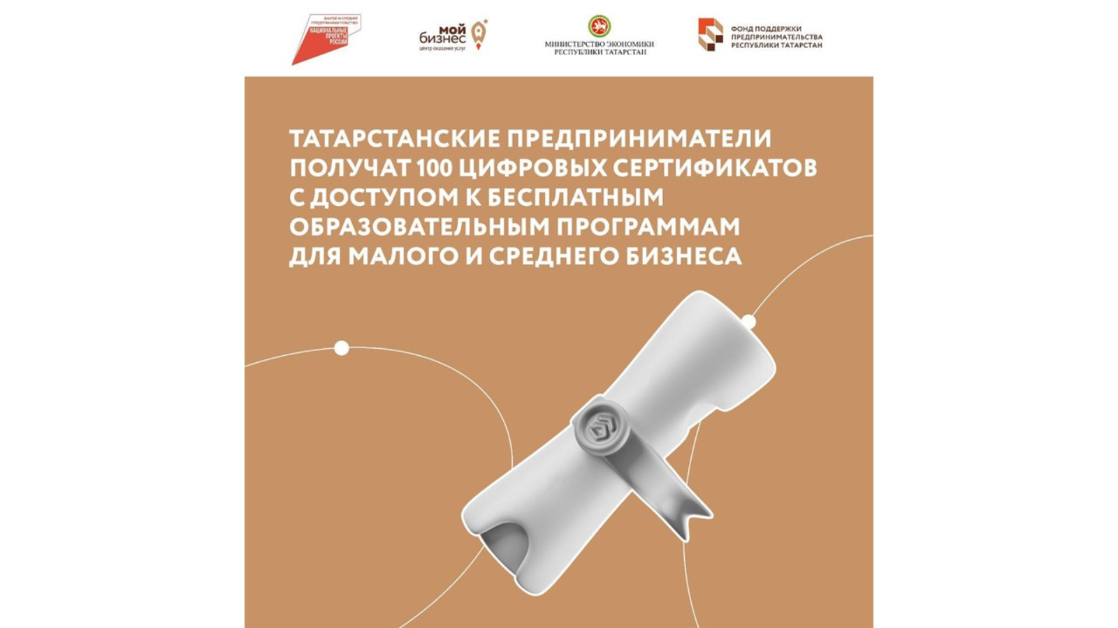 Татарстан эшкуарлары кече һәм урта бизнес өчен түләүсез белем бирү программаларына керү мөмкинлеге булган 100 цифрлы сертификат алачак. Бизнесның яңа технологияләренә өйрәтү өчен сертификатлар «кече һәм урта эшкуарлык»милли проектын тормышка ашыру кысаларында агымдагы ел ахырына кадәр таратылачак.