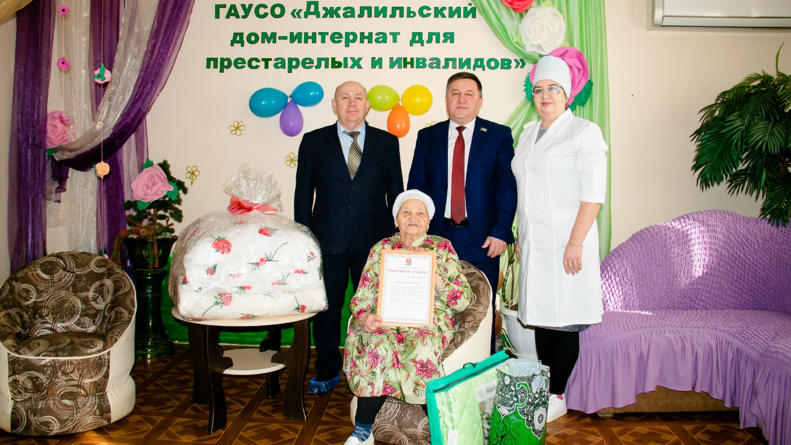 Бу кояшлы көнне Сарман муниципаль районы башкарма комитеты җитәкчесе Вәлиев Ф.Ә., «Җәлил шәһәр тибындагы поселок» муниципаль берәмлеге башлыгы Җәлил Кәримов Р.Ә. һәм «Өлкәннәр һәм инвалидлар өчен Җәлил интернат-йорты» коллективы котлауларын җылы сүзләр белән кабул итте. Кунаклар туган көненә Сарман муниципаль районы Башлыгының Рәхмәт хатын, истәлекле бүләкләр тапшырдылар.