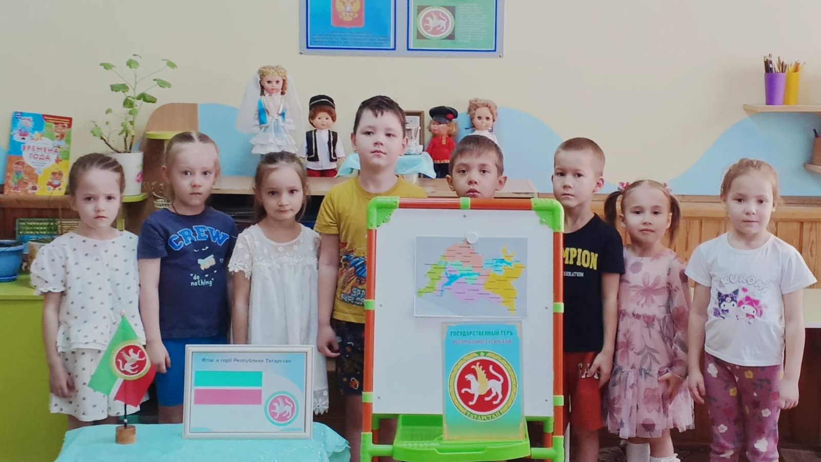 "Әкият" балалар бакчасында тематик әңгәмә үткәрелде һәм гербның кабул ителүе, аның тарихы турында презентация күрсәтелде. Балалар безнең республика турында күп белделәр, аның истәлекле урыннары турындагы китапларны карадылар, алган белемнәрен ныгытып, Республика гербын буядылар.