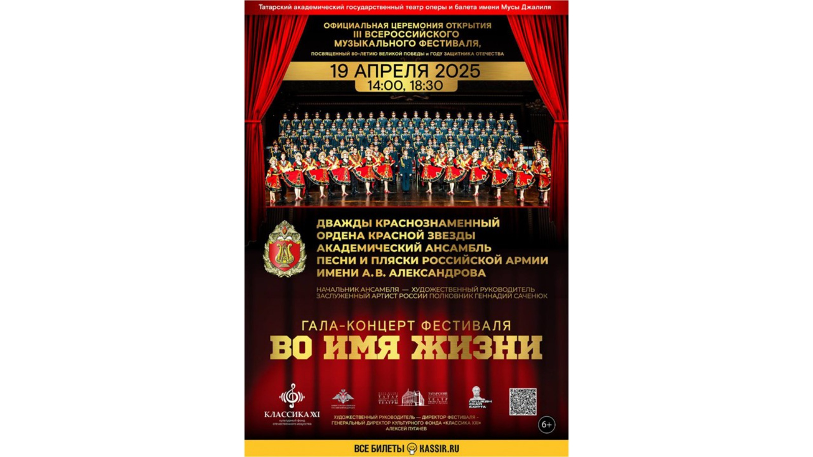 19 апрельдә 14.00, 18.30 сәгатьләрдә М.Җәлил исемендәге Татар дәүләт академия опера һәм балет театрында Россия Федерациясе Оборона министрлыгының Александров исемендәге Россия армиясенең ике мәртәбә Кызыл Байраклы академия җыр һәм бию ансамбленең гала-концертлары була.