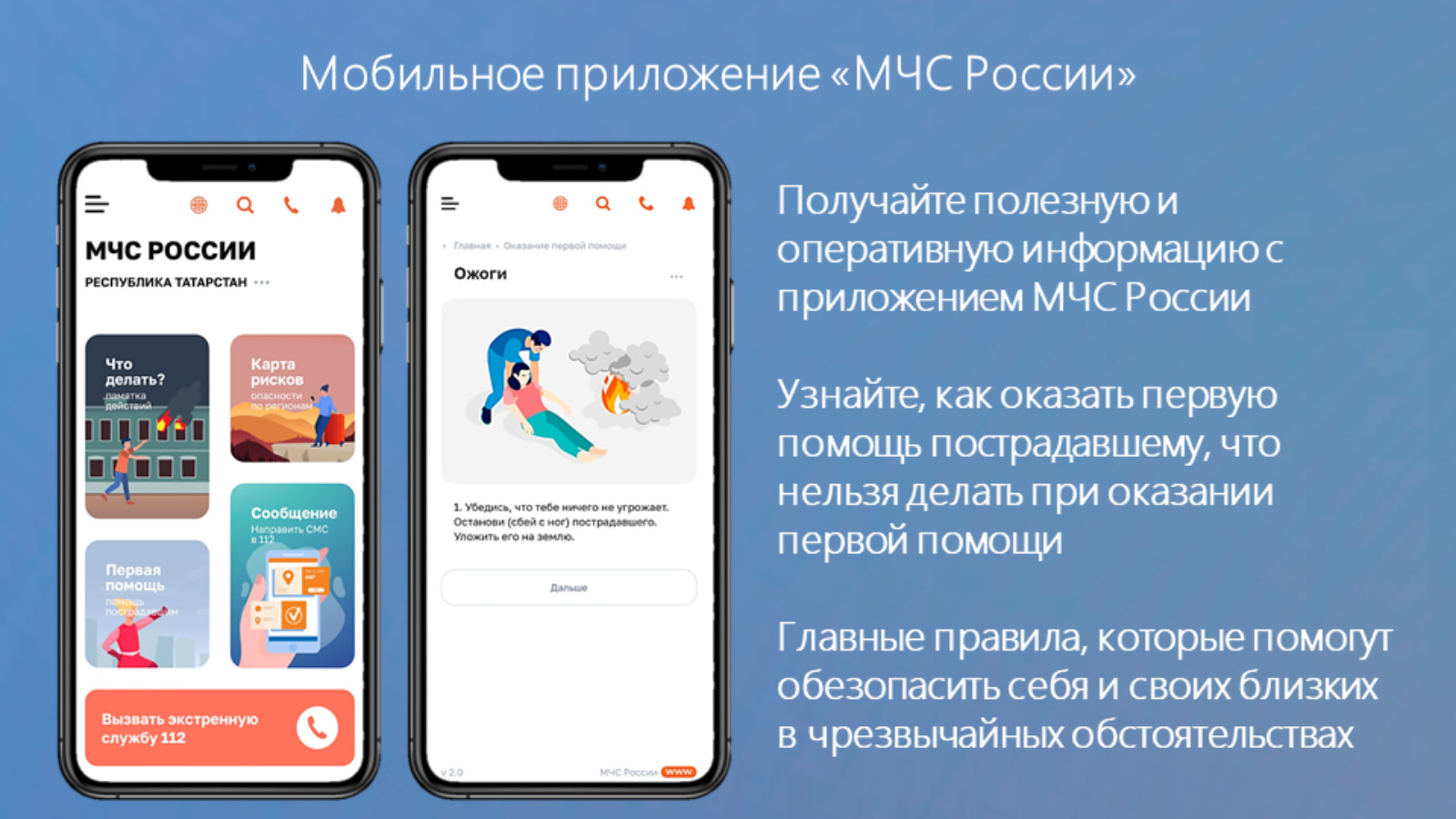Мобиль җайланмаларны кулланучылар өчен "Россия гадәттән тыш хәлләр министрлыгы"Яңа кушымтасы барлыкка килде. Кушымта iOS һәм Android базасында операцион системалар идарәсендә эшли һәм App Store, Google Play һәм Rustore кушымталар кибетләрендә бар. Кушымтага геолокацияне билгеләү белән ашыгыч оператив хезмәтләрне тиз чакыру функциясе өстәлгән. Кушымтаның уникаль үзенчәлеге-кулланучылар РСЧС көндәлек идарәсе органнарыннан ашыгыч мәгълүмат белән мизгелле push-хәбәрләр алырга мөмкин,шул исәптән БПЛА һөҗүме яки куркыныч метеорологик күренешләр турында. Моның өчен кулланучыга «көйләүләр»бүлегендә хәбәрнамәләр алуга рөхсәт бирергә кирәк. Моннан тыш, кушымтада төрле ситуацияләр буенча белешмәләр урнаштырылган (фатирда газ исе сизгән, сирена тавышын ишеткән, лифтта тоткарланган, терекөмешле градусникны ваткан, эт тешләгән, урманда адашкан һәм башкалар), беренче ярдәм күрсәтү буенча, куркынычсызлык кагыйдәләрен белүгә тестлар урнаштырылган.
