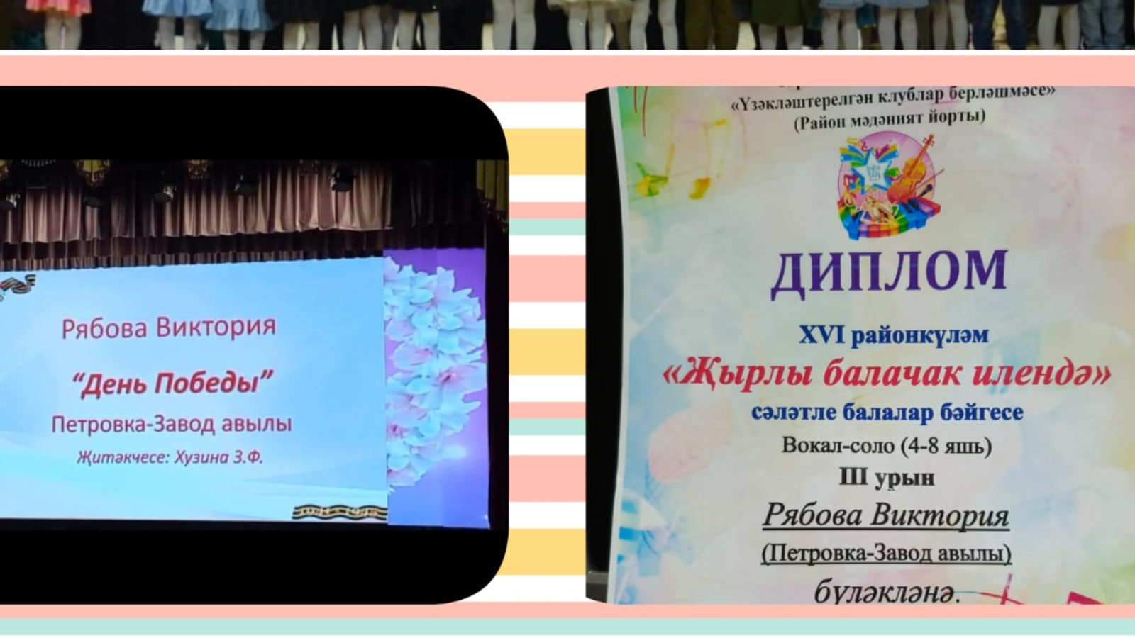Мәктәпкә эзерлек төркемендә тәрбияләнүче Рябова Виктория Сарман районында үткәрелгән яшь талантлар "Җырлы балачак илендә " исемләнгән бәйгедә катнашып 3 нче урынга лаек булды. 👏🌺🥰