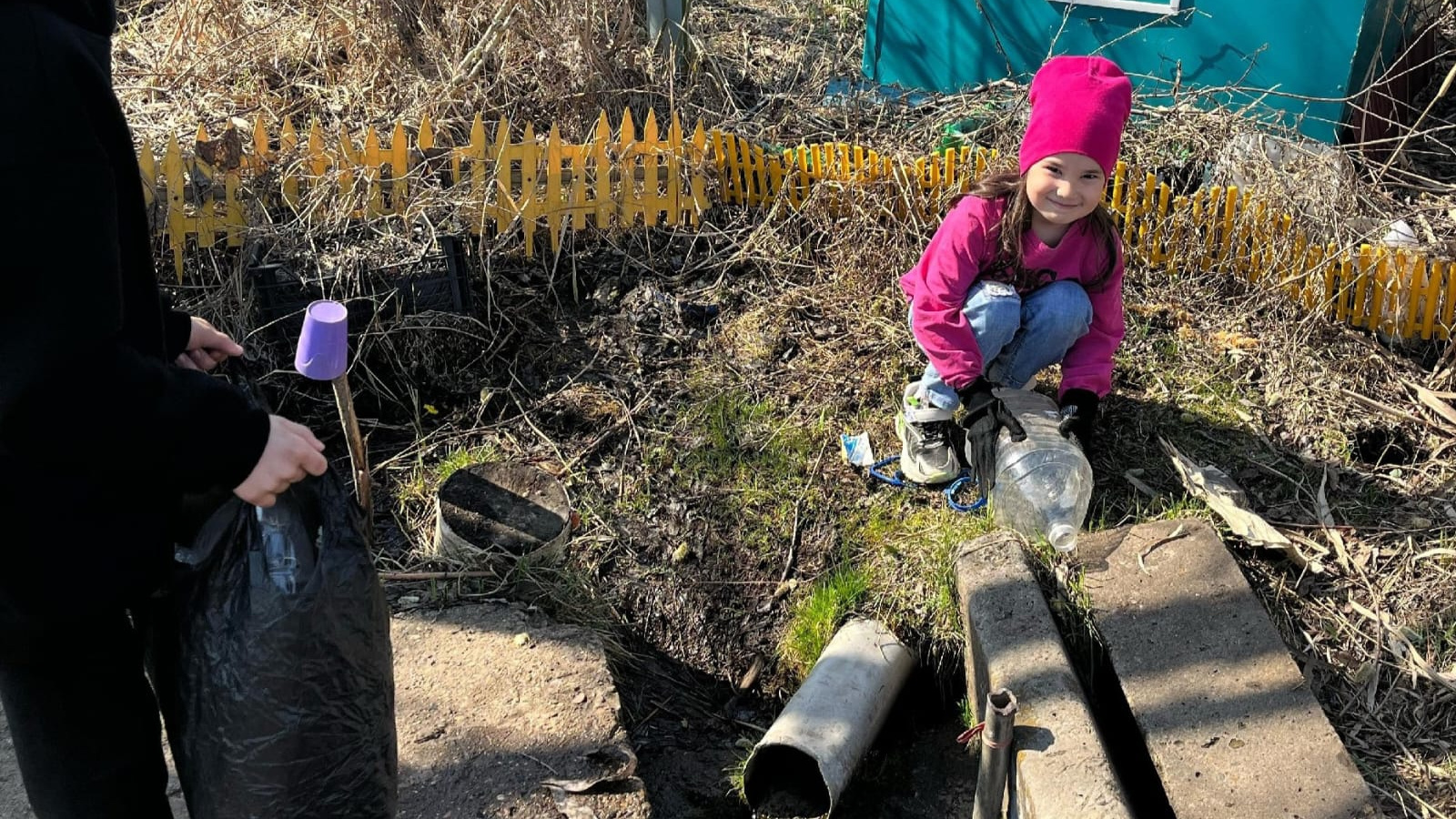 Уртанчылар төркеменә йөрүче Халиуллина Алина чишмә тирәсен чистартуда катнаша.
