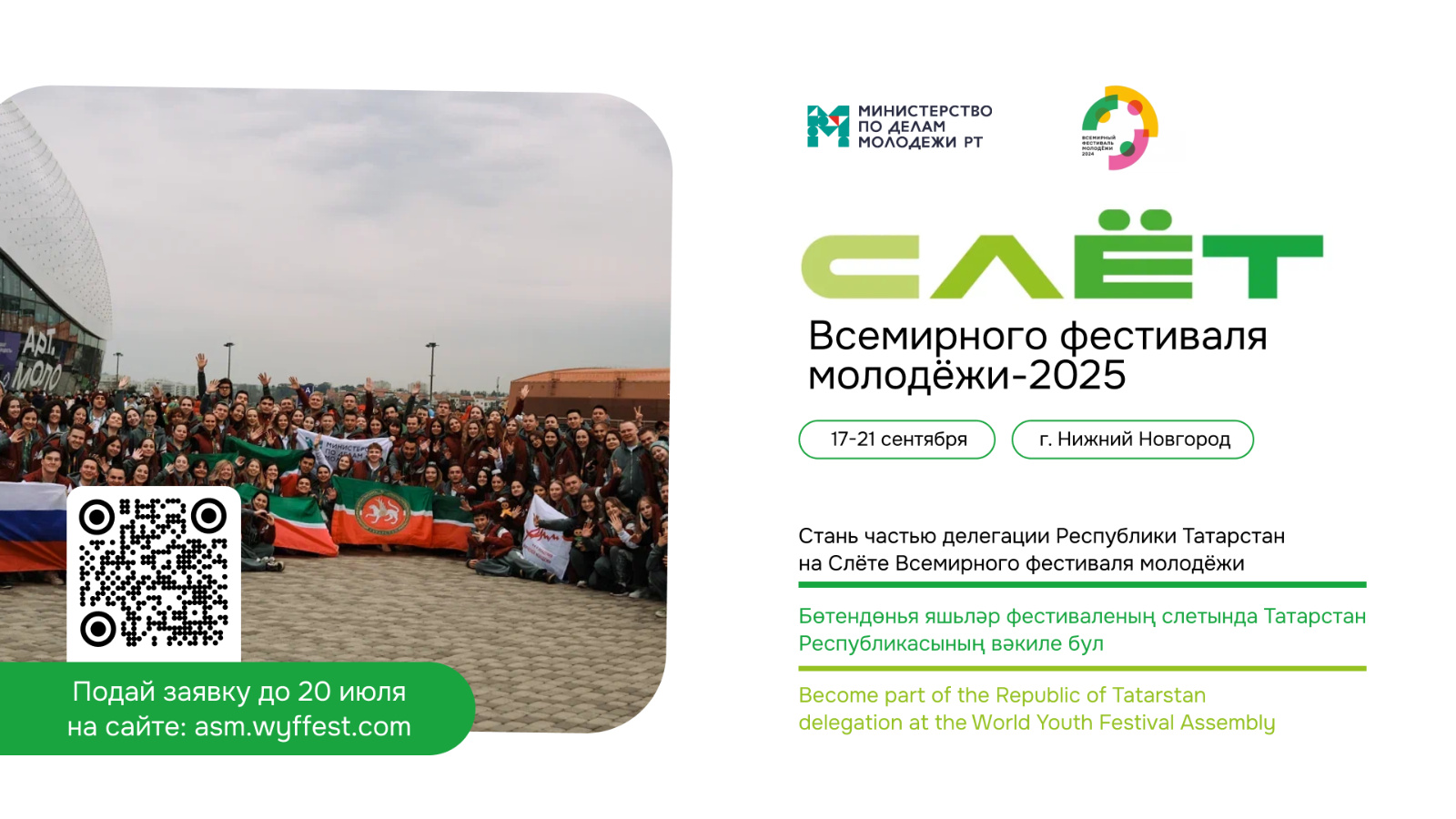 Бөтендөнья яшьләр фестивале слетына Татарстан делегациясе составында эләгү өчен сайтта гариза бир: https://asm.wyffest.com/ 20 июльгә кадәр.