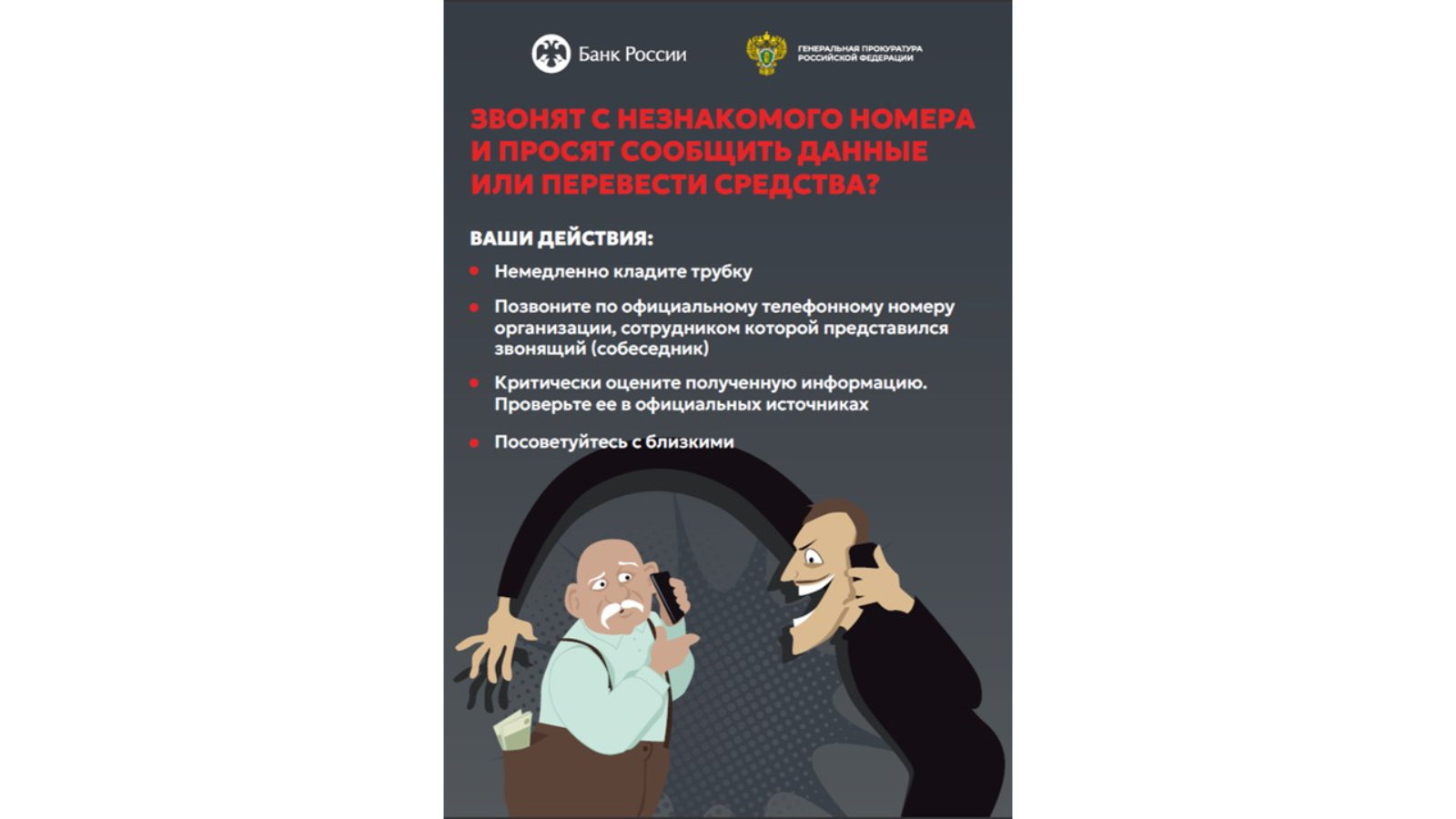 Мәгълүмат-телекоммуникация технологияләрен кулланып кылынган җинаятьләргә һәм хокук бозуларга каршы көрәшнең беренче бурычы шартларында Россия Федерациясе Прокуратурасы органнары тарафыннан әлеге өлкәдә гражданнарның саклыгын тәэмин итүгә юнәлдерелгән актив эш алып барыла. Җинаятьчел һөҗүмнәр куркынычы арту сәбәпле, Россия Федерациясе Генераль прокуратурасы Россия Банкы белән берлектә акча урлау максатларында ялгыш юлга этәрүче затларның гамәлләре турында халыкка мәгълүмат җиткерү дәрәҗәсен арттыру максатыннан цифрлы плакатлар әзерләде.