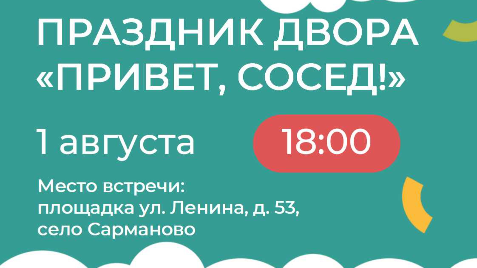1 августта Сарман авылы, Ленин урамы, 53 нче йорт ишегалды адресы буенча " Сәлам, күрше!" конкурсында җиңүче булды. Димәк, хәзер сезнең ишегалды һәркем үзен бердәм берлекнең бер өлеше итеп тоя алырлык урын булачак. 🎯 Безнең чараның максаты-ишегалды халкы арасында Игелек, үзара аңлашу һәм ярдәм атмосферасы булдыру. Без күршеләрнең бер-берсен исемнәре белән белүләрен, буш вакытларын бергә уздыруларын һәм бер-берсенә ярдәм итүләрен телибез. Бәйрәм программасына: Детей балалар һәм өлкәннәр өчен кызыклы мастер-класслар, приз бүләкләр белән күңелле уеннар һәм конкурслар, жив җанлы музыкаль озата бару, 🧑 🤝 🧑 күршеләр белән танышу һәм аралашу мөмкинлеге. Бу позитив белән корылу, яңа дуслар табу һәм сезнең ишегалдыгызны яшәү өчен тагын да уңайлырак һәм уңайлырак итү өчен менә дигән шанс!