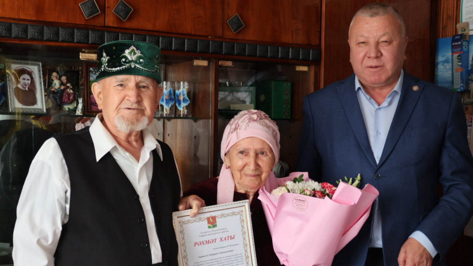 Ветеранны Сарман муниципаль районы Башлыгы Фәрит Мөнәвир улы Хөснуллин котлады, Рәхмәт хаты, чәчәкләр һәм истәлекле бүләкләр тапшырды. Котлауларга Район социаль яклау бүлеге начальнигы Лилия Мирзаһит кызы Гыйльметдинова, «Шәфкать» үзәге директоры Ландыш Зөфәр кызы Мөхлисуллина, Башкарма комитетның мәгариф бүлеге начальнигы Гөлназ Тәлгать кызы Исмәгыйлева, Сарман авыл җирлеге башкарма комитеты җитәкчесе Лилия Ивановна Шәрипова, район ветераннар Советы Рәисе Асыляр Мөнәвир улы Харисов, туганнары һәм якыннары кушылды.