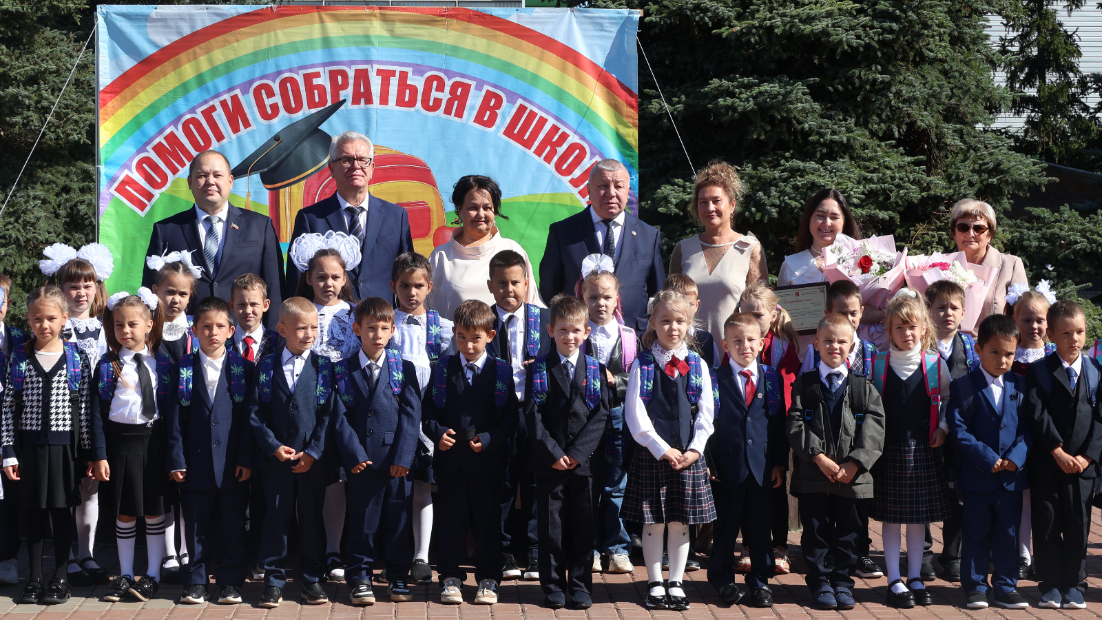 Сарман районы Башлыгы Фәрит Мөнәвир улы Хөснуллин, Татарстан Республикасы Мәгариф һәм фән министрының беренче урынбасары Андрей Иванович Поминов, Татарстан Республикасы Дәүләт Советы депутаты Рияз Фоат улы Комаров 65 беренче сыйныф укучысын котладылар, портфельләр һәм мәктәп кирәк-яраклары тапшырдылар.