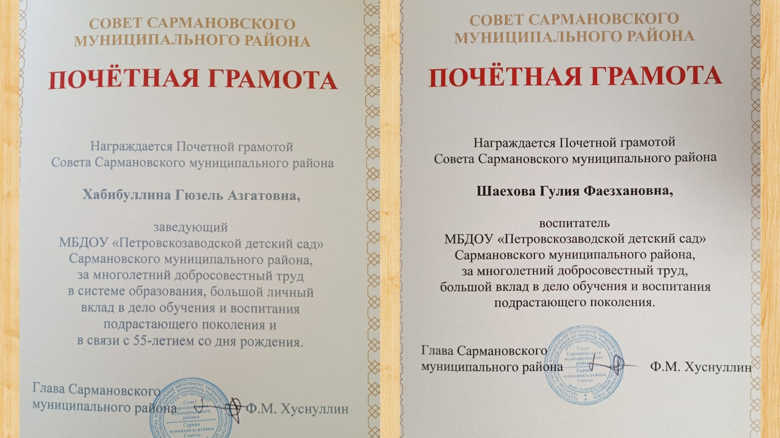 Конференциядә "Петровскозавод балалар бакчасы" МБББМУ мөдире Хәбибуллина Гүзәл Әзгат кызы , тәрбияче Шәехова Гөлия Фәезхан кызы - Татарстан Республикасы Сарман муниципаль районы Советының Мактау грамотасы белән бүләкләнделәр. Аларны котлыйбыз һәм алга таба эшләрендә уңышлар телибез