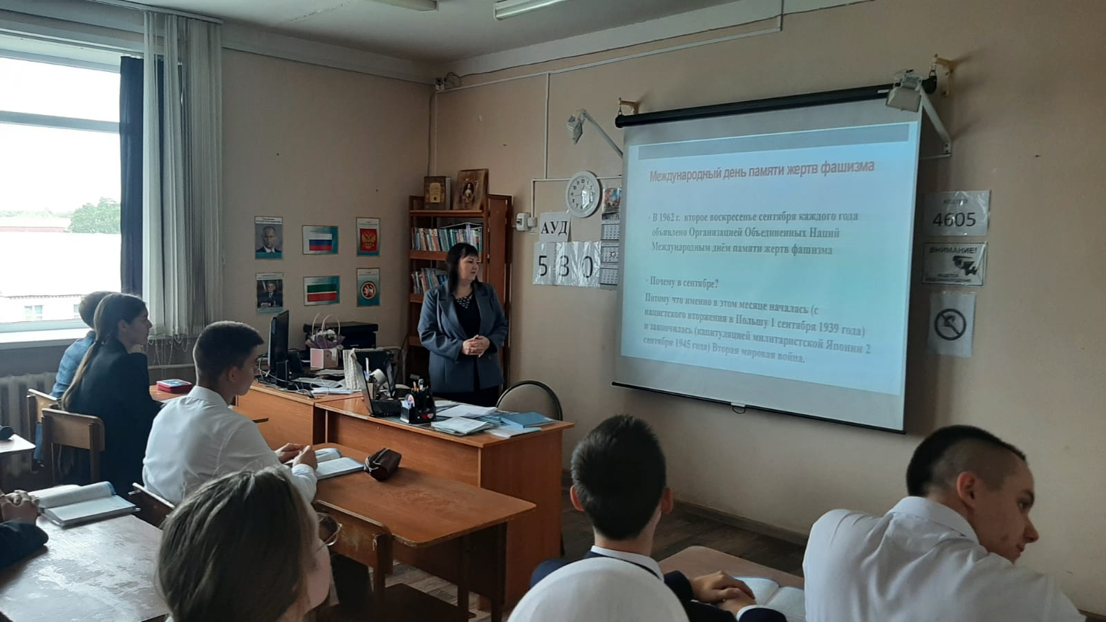 Халыкара фашизм корбаннарын искә алу көне алдыннан тарих укытучысы Фәрхетдинова Д.ф. МБГББУ «Җәлил гимназиясе»нең 11 нче сыйныф укучылары белән әңгәмә үткәрде. Дискуссия узган гасырның нацизм рәхимсезлеге һәм хәрби конфликтларның нәтиҗәләре белән бәйле фаҗигале вакыйгаларына багышланган иде. Тарихи хәтерне саклауга аерым игътибар бирелде. Балалар диалогта актив катнаштылар, сораулар бирделәр һәм күтәрелгән сорауларга үз мөнәсәбәтләрен белдерделәр. Әңгәмә сугыш елларында һәлак булган миллионнар истәлегенә бер минут тынлык белән тәмамланды. Гимназистлар үз халкының тарих битләрен өйрәнүне дәвам итәргә һәм Җирдә тынычлыкны сакларга вәгъдә бирделәр.