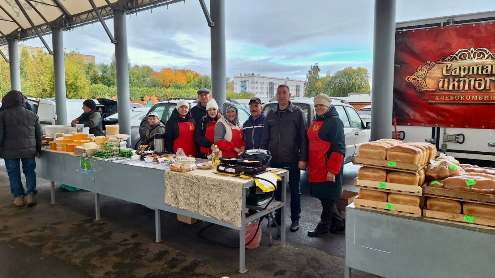 Бүген Сарман муниципаль районы ярминкә мәйданчыгында авыл хуҗалыгы җитештерүчеләренең товарларын тәкъдим итә. Теләүчеләрне кайнар чәй һәм коймак белән сыйлыйлар.