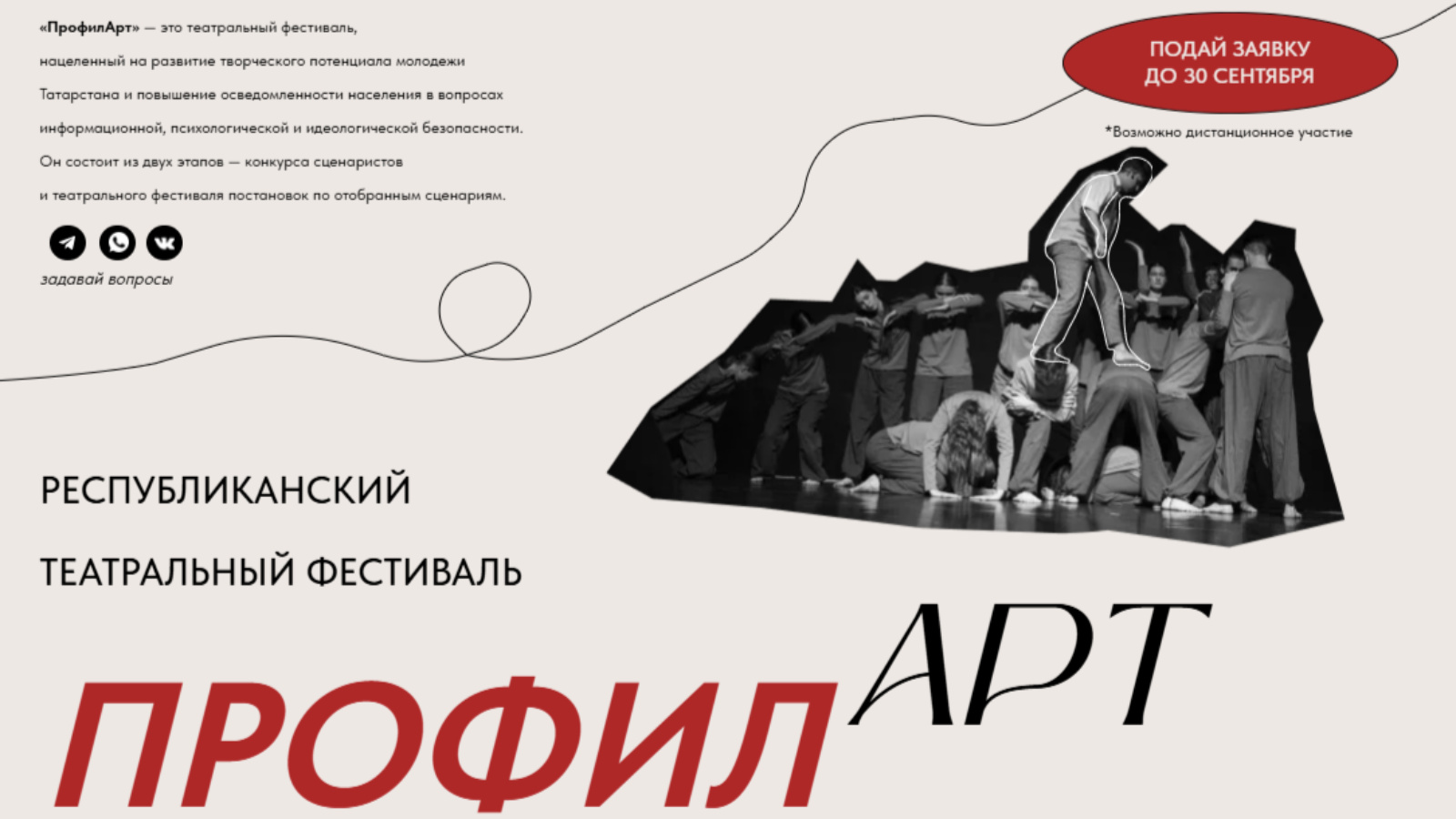Татарстан Республикасы Яшьләр эшләре министрлыгы һәм "Татарстан Республикасы Иҗади яшьләр академиясе" төбәк иҗтимагый оешмасы тарафыннан Татарстан Республикасында Террорчылыкка каршы комиссия аппараты координациясендә 2025 елның 29 апреленнән 1 декабренә кадәр» ПрофилАрт «Республика театр фестивале уздырыла, аның кысаларында социаль әһәмияткә ия темаларга "ПрофилАрт" театраль куелышлар республика конкурсы гамәлгә ашырыла.