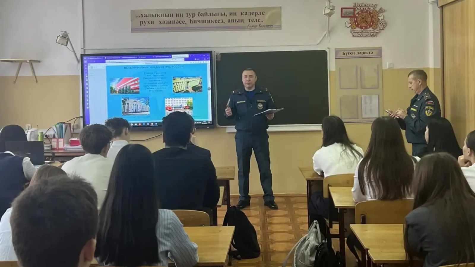 Сарман янгын-коткару гарнизоны начальнигы Таҗетдинов Руслан Әмирҗан улы Мөслим һәм Сарман муниципаль районнары буенча күзәтчелек эшчәнлеге һәм профилактика эше бүлеге өлкән инспекторы Гарипов Рөстәм Габделхәй улы белән бергә МББУ «Җәлил 2 нче санлы урта гомуми белем бирү мәктәбендә» булдылар.
