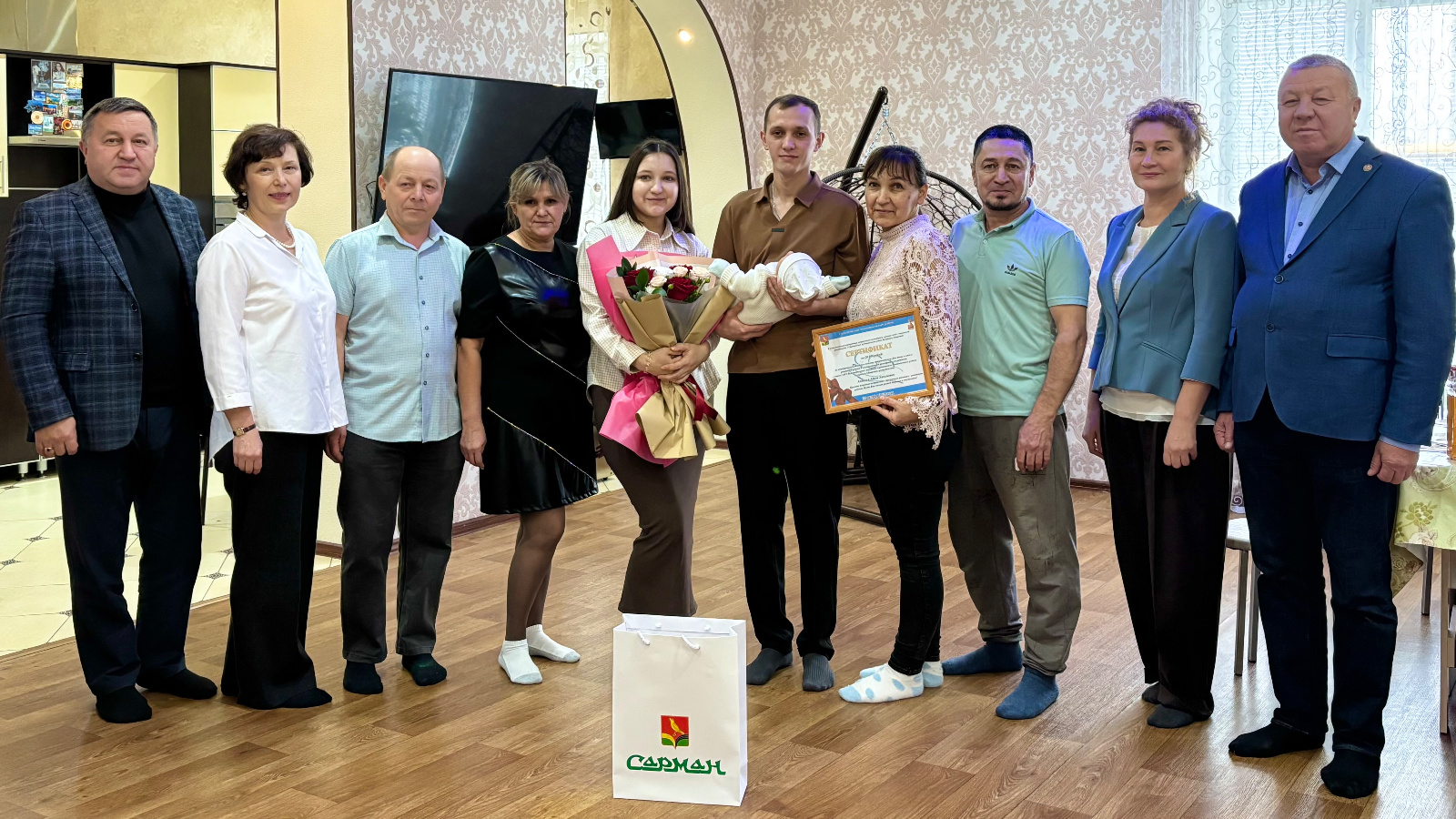 Яшь гаиләләргә ярдәм итүгә, районда туучылар санын арттыруга һәм бала тууга бәйле чараларны гамәлгә ашыру максатларында, Алмаз һәм Адилә Хәкимовларның уллары - Эминнең Әтиләр көнендә тууы уңаеннан Сарман районы башлыгы Фәрит Мөнәвир улы Хөснуллин котлады һәм балалар коляскасын сатып алу өчен, сертификат бүләк итте. Котлауларга район Башкарма комитеты җитәкчесе урынбасары, район Хатын-кызлар Советы рәисе Индира Сәхипова, ГХАТ бүлеге җитәкчесе Гөлчәчәк Вәлишина, Җәлил бистәсе башлыгы Рәфыйк Кәримов та кушылдылар.