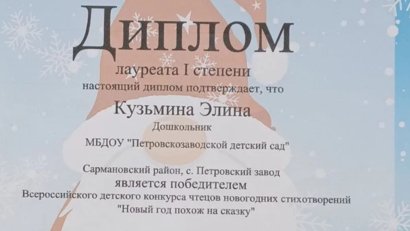 Безнең олкән төркемдэге бала Кузьмина Элина - "Яңа ел әкияткә охшаган" дип аталган Яңа ел шигырьләренен Бөтенроссия конкурсында җиңүче.
