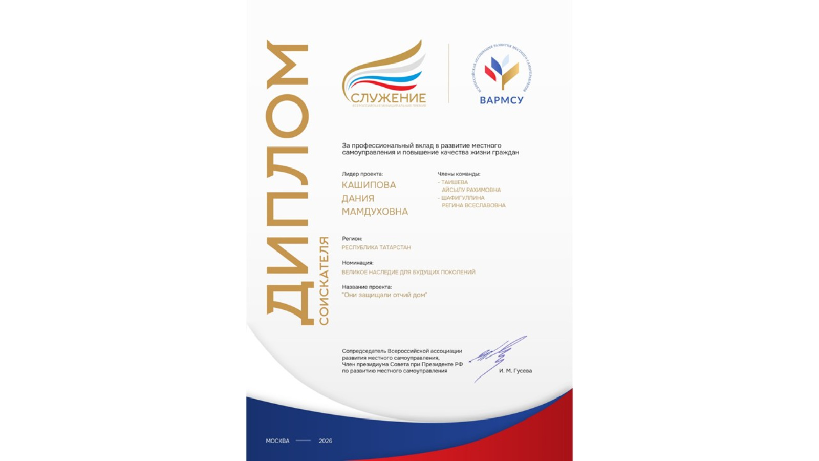 Бу премия – гади генә бәйге түгел. Ул – халыкка һәм кече Ватаныбызга намуслы хезмәт итү үрнәге . Президент Владимир Путин тарафыннан булдырылган әлеге премия муниципаль хезмәткәрләрнең, мәдәният һәм мәгариф вәкилләренең проектларын берләштерә .