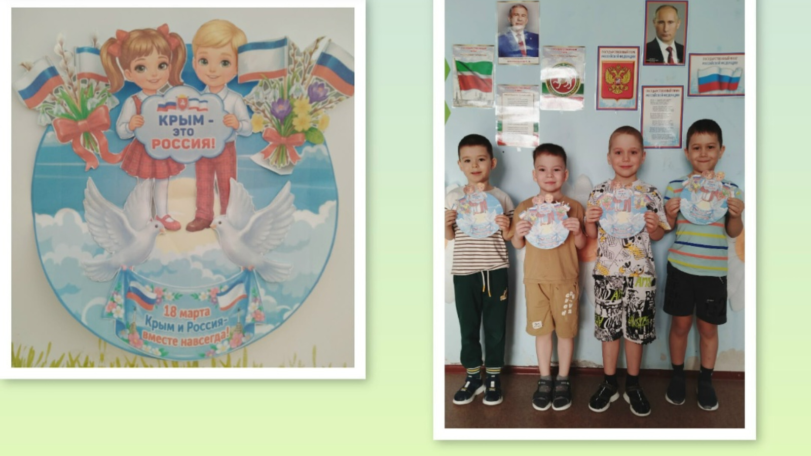 18 мартта безнең ил үзенчәлекле датаны — Кырымның Россиягә кушылу көнен билгеләп үтә. Бу бәйрәм тынычлык, тотрыклылык һәм бердәмлекне символлаштыра, без аларны барыбыз да кадерлибез һәм сакларга омтылабыз. Өлкән төркемдә тәрбияләнүчеләр читтә калмадылар һәм әлеге истәлекле датага багышланган тематик чара үткәрделәр. Чараның максаты балаларны ярымутрауның тарихы белән таныштыру һәм бу вакыйганың бөтен ил өчен әһәмиятен күрсәтү иде. Алар 2014 елның мартында булган вакыйгалар турында белделәр һәм бу датаның Россиянең һәр кешесе өчен ни өчен мөһим булуын аңладылар. Иҗади эшчәнлек аеруча игътибарны җәлеп итте: тәрбияләнүчеләр "Россия һәм Кырым бергә һәм мәңгегә!" дип аппликация ясадылар."Мондый чаралар балаларга кечкенәдән туган якның кыйммәтен аңларга һәм патриотизм хисе формалаштырырга ярдәм итә.