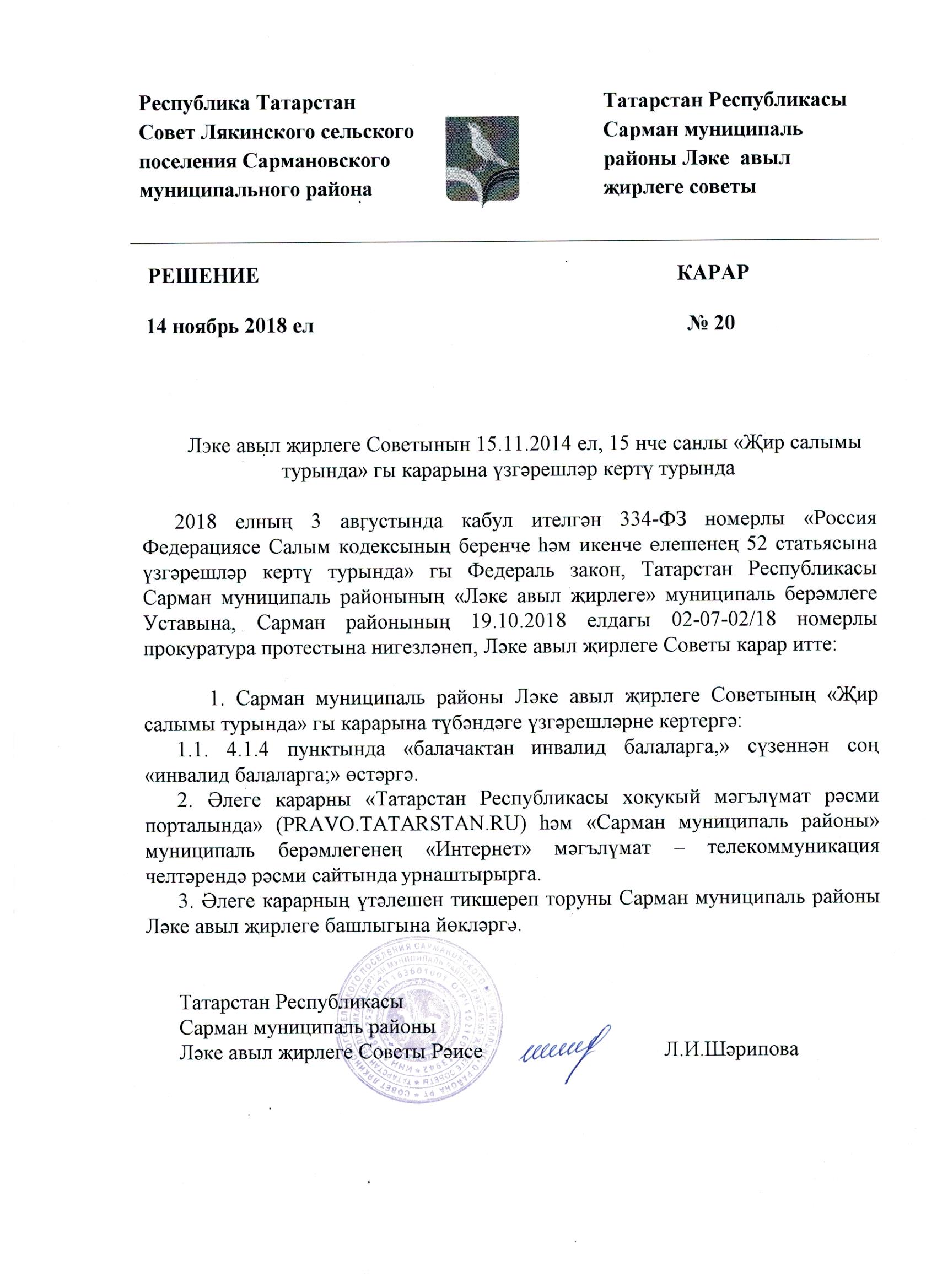 Лэке авыл җирлеге Советының 2018 елның 12 нче декабрендә кабул иткән 25 нче номерлы карары "Татарстан Республикасы Сарман муниципаль районы «Ләке авыл җирлеге» муниципаль берәмлеге Уставына үзгәрешләр һәм өстәмәләр кертү турында